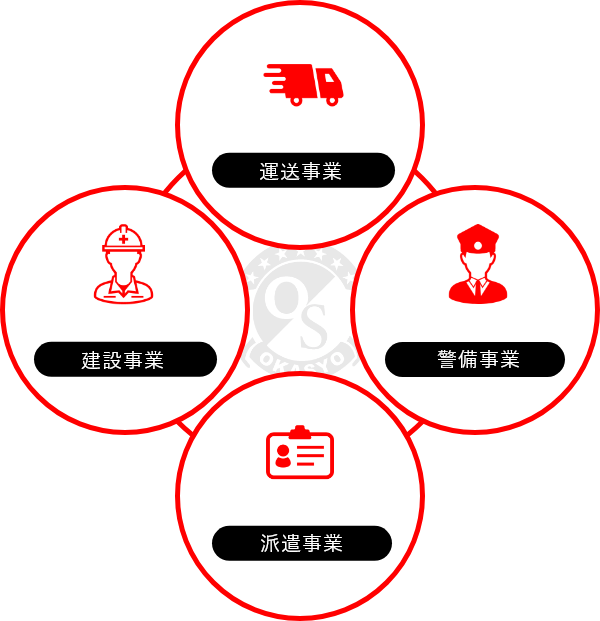 岡昇株式会社では、「運送事業」「建設事業」「警備事業」「派遣事業」の4つ事業を営んでおり、事業同士の連携によって自社独自の多種多様なサービスを様々なお客様へ提供しております。